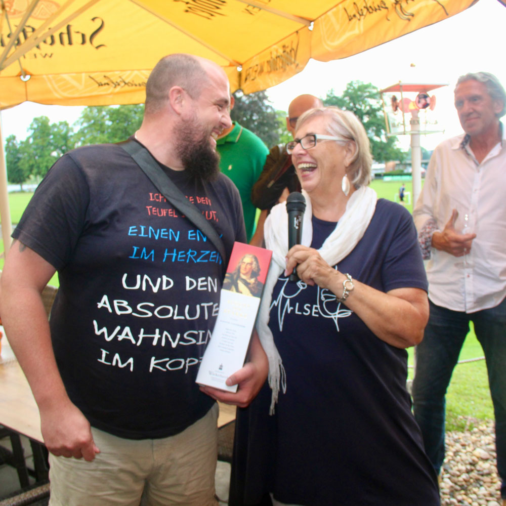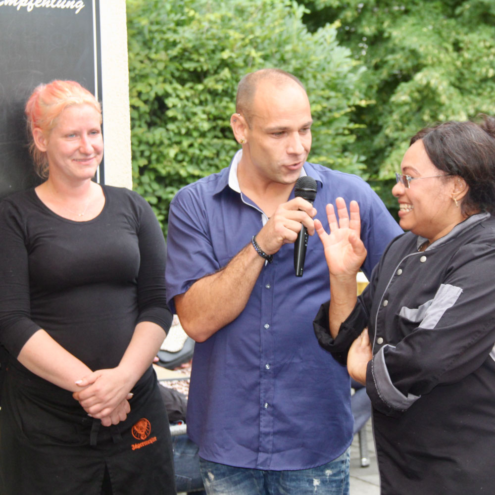 Und als der wohl wichtigste Satz des Abends ertönte: „Das Buffet ist eröffnet.“, da gab es dann viel zu bestaunen. Nicht nur Salate und Fleisch sowie Obst und leckere Desserts, alles arrangiert von der Lokalität, die selbst Netzwerkmitglied ist, sondern auch die leckere Bratwurst, die die Fleischerei Pirsch, ebenfalls Mitglied des GNWP, für diesen Abend beisteuerte. So gab es Trüffel-, Tomate-Mozzarella-, Vietnam- oder Zitronengrasbratwurst frisch vom Grill. Und weil jeder mal so viel wie möglich kosten wollte, kam es auf die Teilung der Bratwürste an. Und so wurde eifrig geteilt, ganz nach dem Motto: Gib Du mir die Hälfte von Deiner und erhalte die andere Hälfte von meiner.